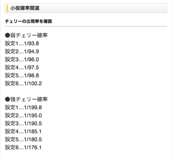 高設定ほど強チェリー確率が高く、弱チェリー確率が低い。