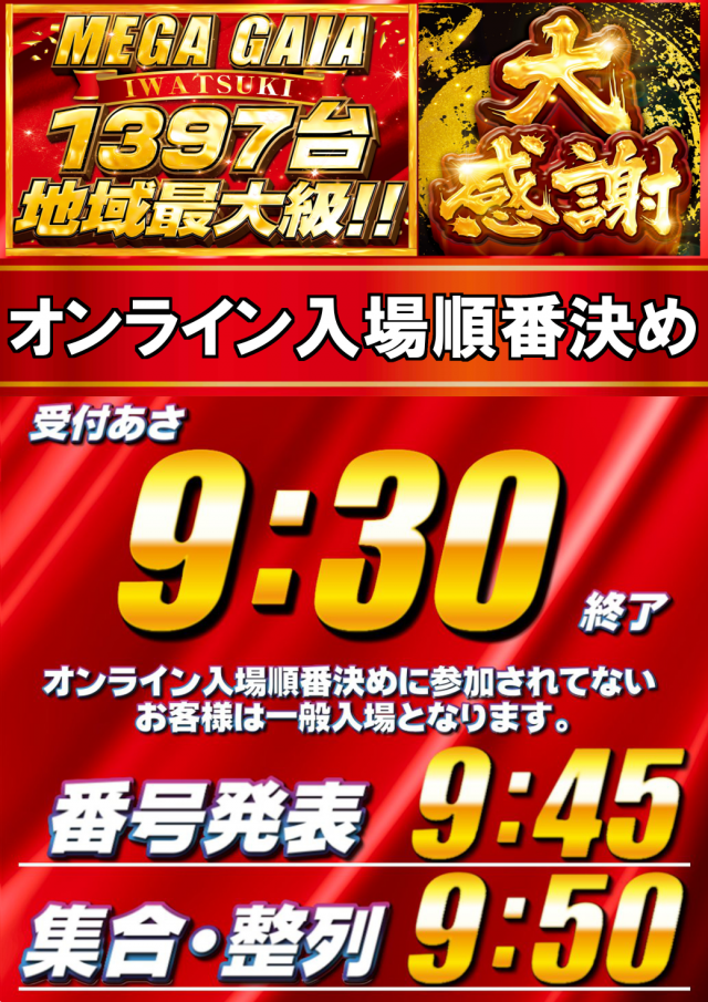お並び順の入場ではございません。入場順番決めは入場くんオンラインより当日朝8:00~9:30までに参加をお願い致します。 |