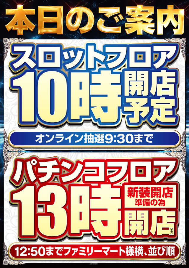 オンライン入場順番決め参加のお客様→一般入場のお客様の順に入場となります。①オンライン入場順番決めは当店LINEより前日19時~当日朝9:30までに参加をお願いします。②番号発表は9時45分・再整列時間は9時50分となります。③一般入場はお並び順での入場となります。 |