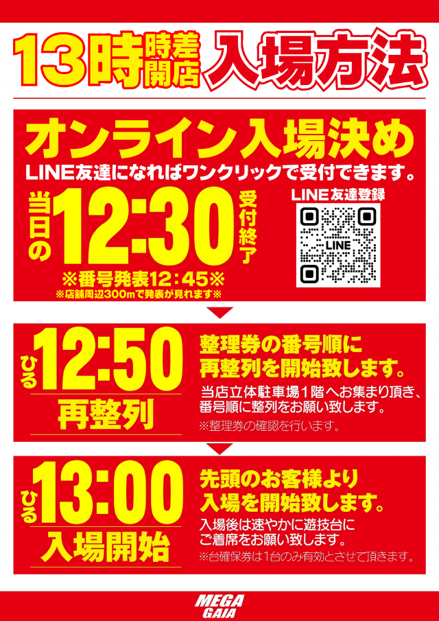 オンライン入場順番決め参加のお客様→一般入場のお客様の順に入場となります。①オンライン入場順番決めは当店LINEより前日19時~当日朝9:30までに参加をお願いします。②番号発表は9時45分・再整列時間は9時50分となります。③一般入場はお並び順での入場となります。 |