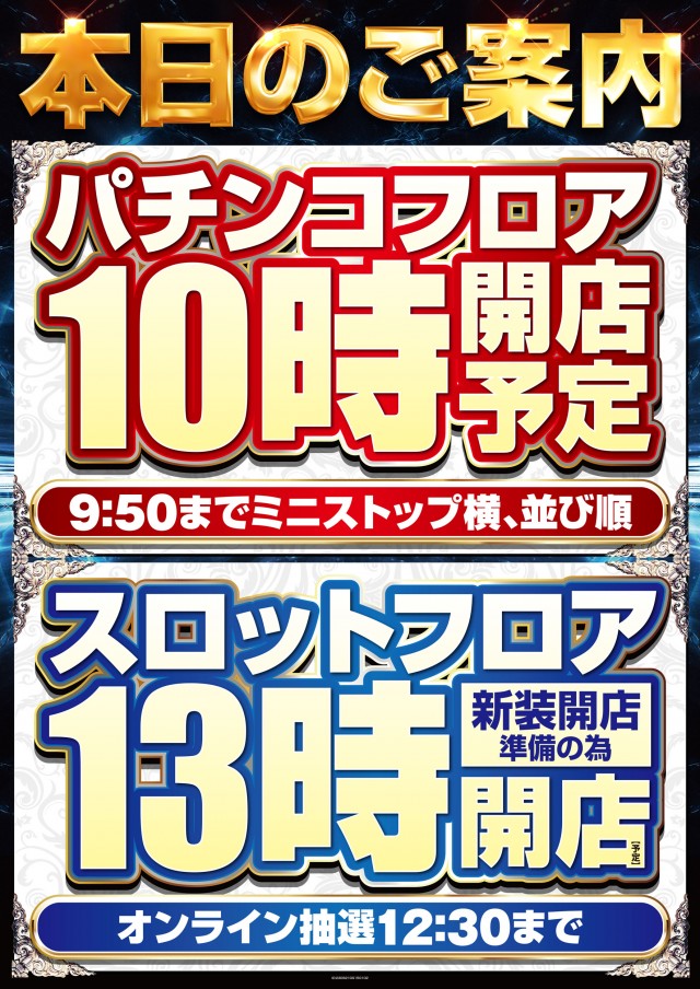 オンライン入場順番決め参加のお客様→一般入場のお客様の順に入場となります。①オンライン入場順番決めは当店LINEより前日19時~当日朝9:30までに参加をお願いします。②番号発表は9時45分・再整列時間は9時50分となります。③一般入場はお並び順での入場となります。 |