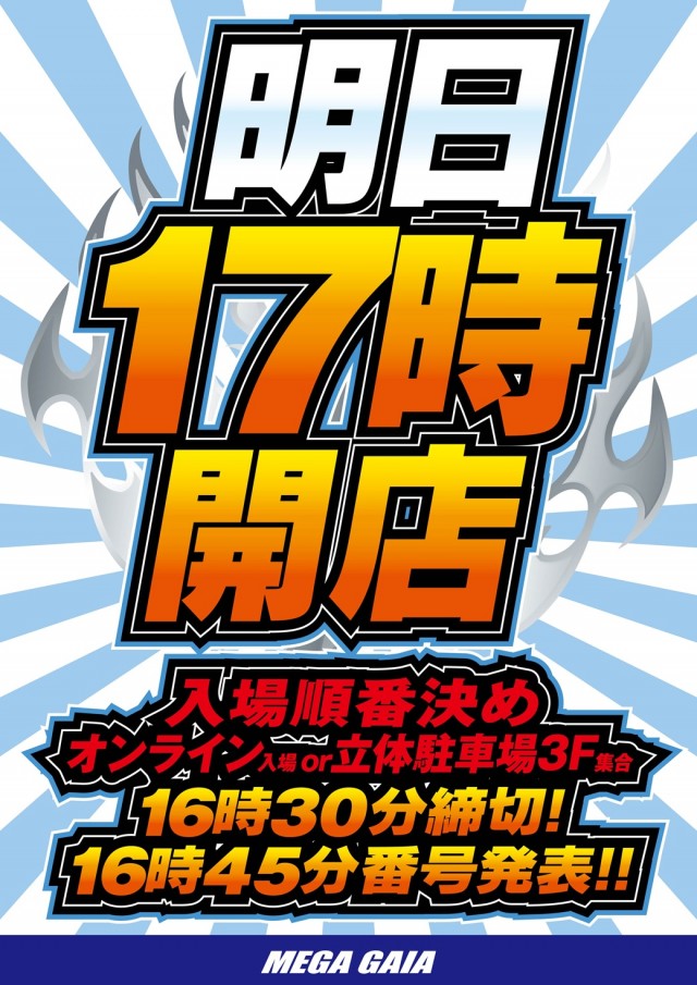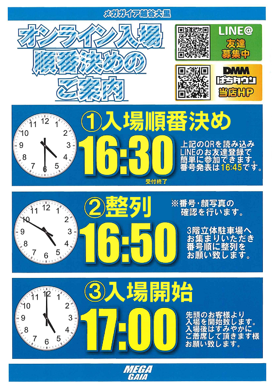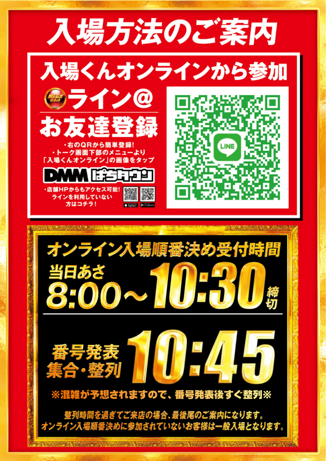 お並び順の入場ではございません。①オンライン入場順番決めは当店LINEより、当日朝8:00~9:30までにご参加をお願い致します。三階の立体駐車場までお集まり頂き、再整列時間は9時50分となります。 |