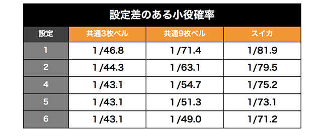 スイカ・共通3枚ベル・共通9枚ベル確率に設定差が存在。通常時は中押しで下段に揃うベル、ボーナス・AT中はセグに0が表示されるベルが共通ベルとなる。