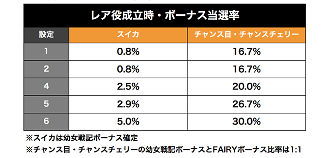 レア役のボーナス当選率は設定差が大きいので注目。とくに差が大きいのは、スイカ+ボーナス(幼女戦記ボーナス確定)だ。