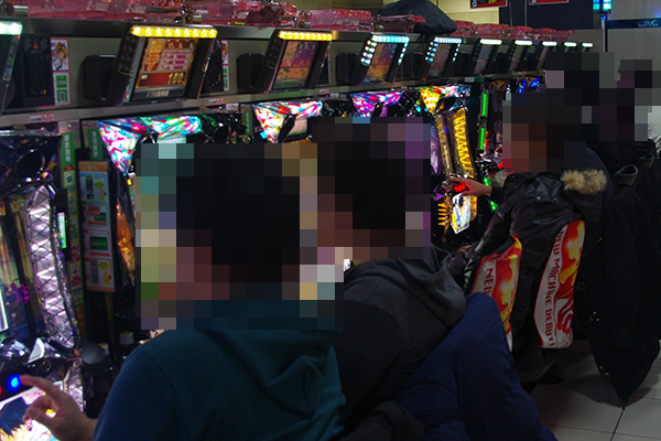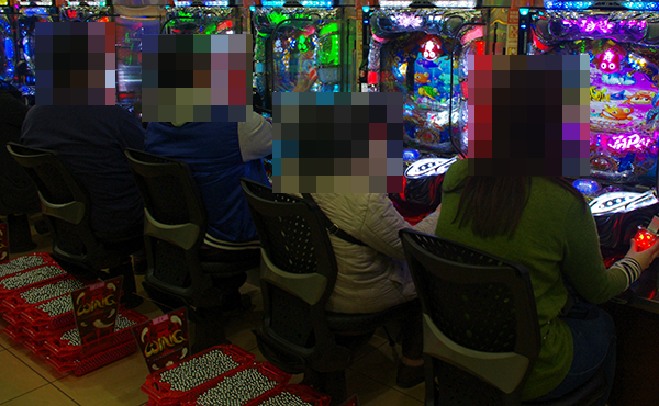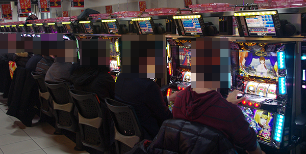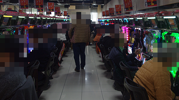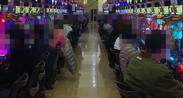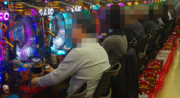 14時頃になっても、4円パチンコの「CR牙狼 魔戒ノ花」に空き台はほとんど見当たらない。遊技中のプレイヤーの多くが笑顔になっており、ひときわ活気が感じられた。