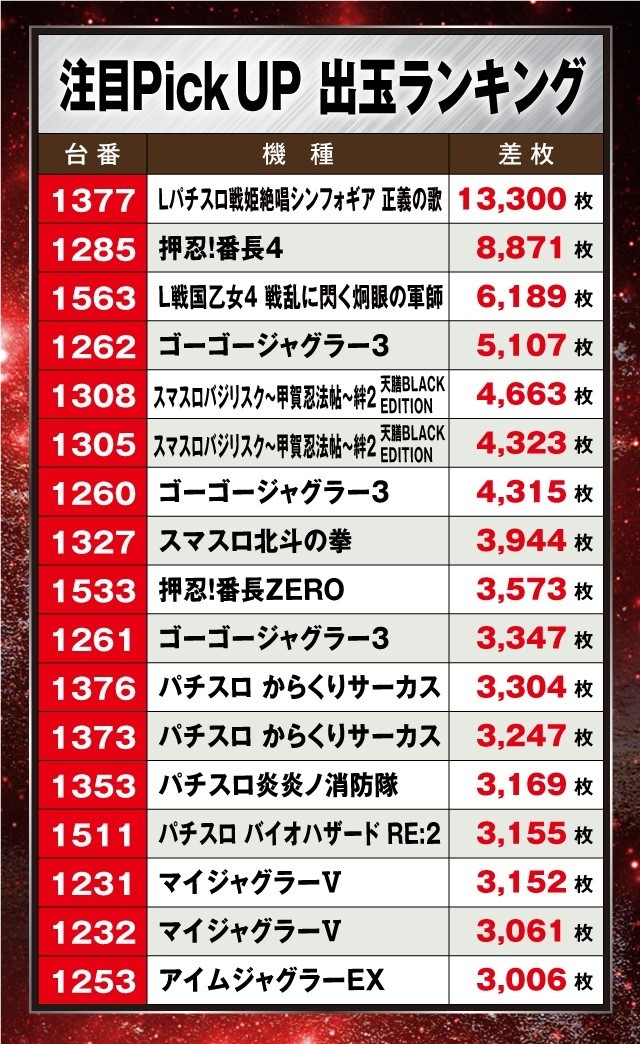 この日、最も盛り上がりを見せたのが『Lパチスロ戦姫絶唱シンフォギア 正義の歌』で万枚超の+13,300枚を記録、また、出玉ランキング2位の『押忍!番長4』が+8,871枚を叩き出す圧巻の結果を残している。