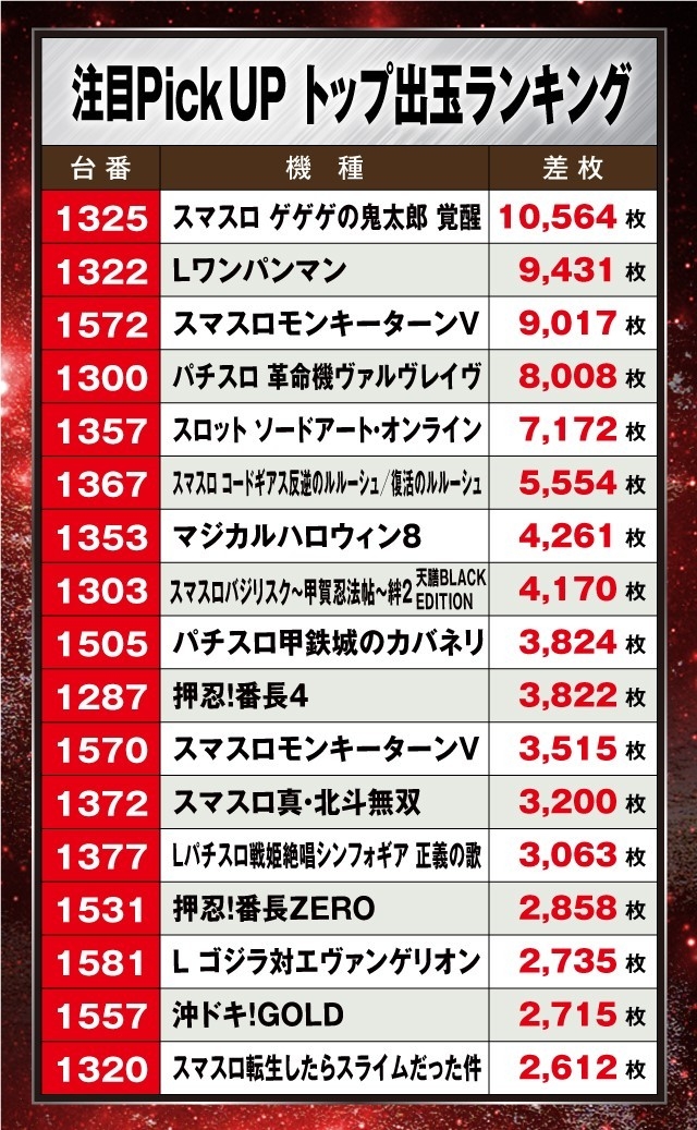 この日はスマスロがアツい一日となった。出玉ランキングトップは万枚超を達成した『スマスロ ゲゲゲの鬼太郎 覚醒』で、2、3位の『Lワンパンマン』と『スマスロモンキーターンV』も+9,000枚超と万枚超に迫る勢いを見せていた。