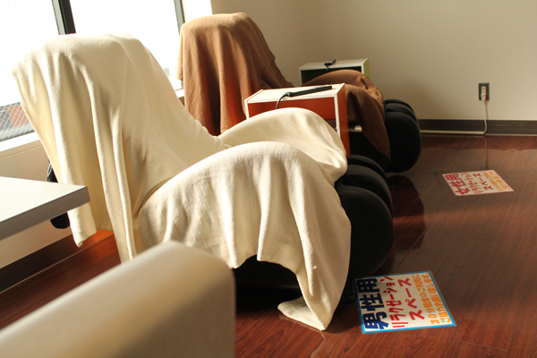 休憩処にはポットや冷水機だけでなくマッサージチェアも設置されている。さらにマッサージチェアは男女別となっていて、細やかな気配りも行き届いていた。