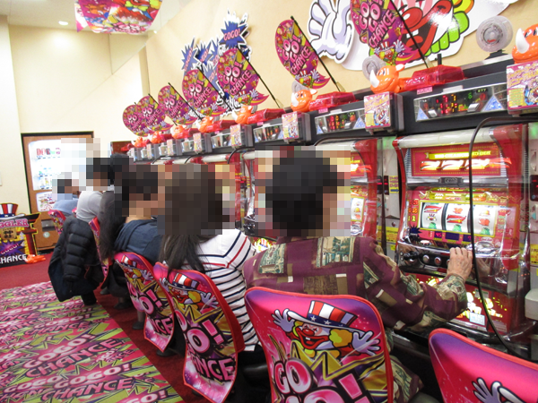 お昼を過ぎる頃には、さらに稼働が上がり、多くのプレイヤーでホール内は活気づいていた。とくにパチスロフロアで盛り上がりをみせていたのは「ハッピージャグラーVⅡ」と「アイムジャグラーSP」である。