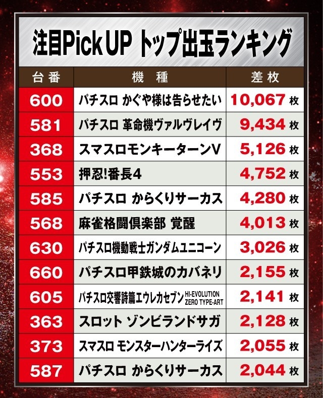 この日、最もプレイヤーの注目を集めたのが『パチスロ かぐや様は告らせたい』で、万枚超の+10,067枚を叩き出しランキングトップに輝いた。続く第2位の『パチスロ 革命機ヴァルヴレイヴ』も万枚目前の+9,434枚を記録している。
