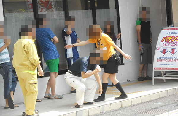 パチンコとパチスロで列が分かれているが、この日はパチスロの遊技を希望していたプレイヤーが多かった。