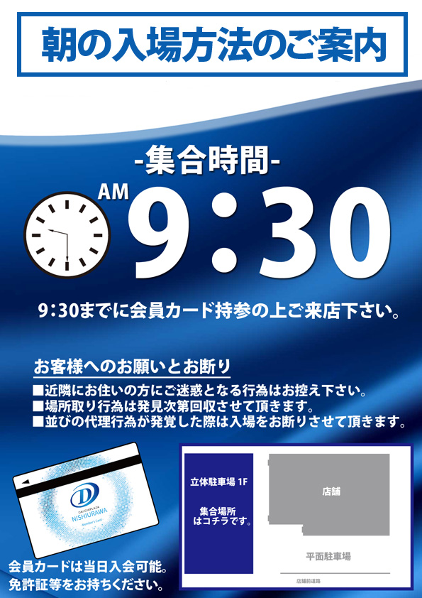 朝の入場抽選参加には会員カードが必要となります。その場で作成が可能です。ご希望のお客様は免許証・保険証などのご本人様であることを確認できるものをお持ちください。 |
