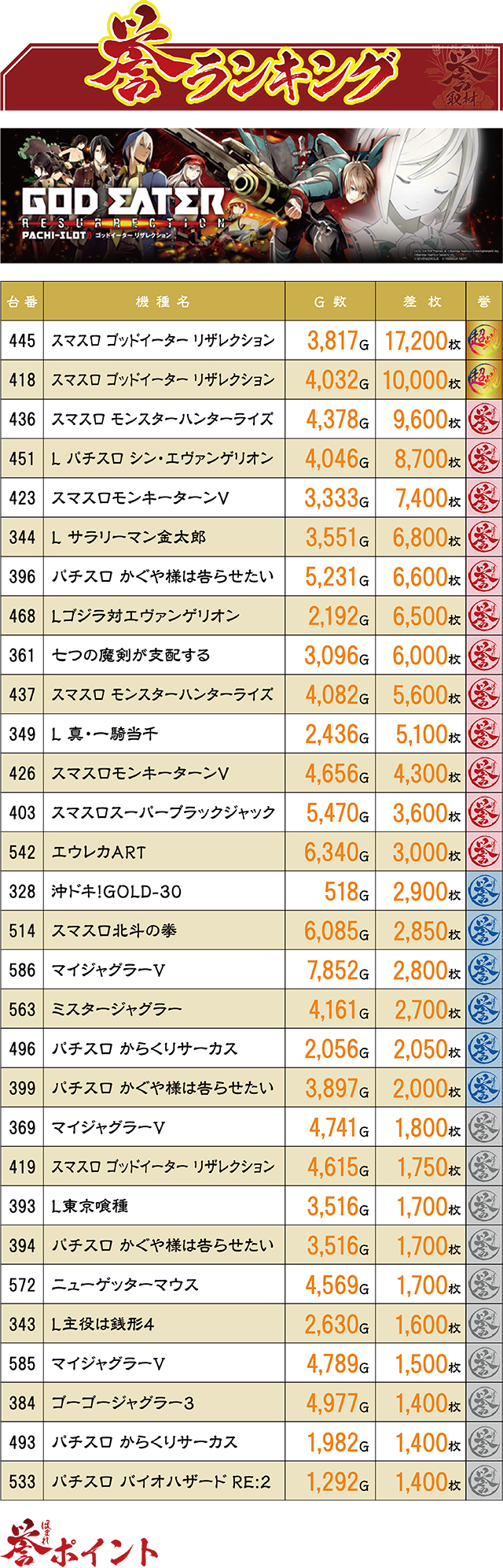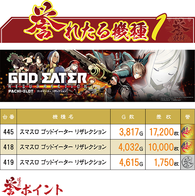 前日・前々日と同じく、この日も10,000枚オーバー記録がお目見え。この日は『スマスロ ゴッドイーター リザレクション』から2台の10,000枚レコードが誕生した。前日の誉取材では、人気機種が誉ランキングに複数ランクインし、人気機種への注力具合がうかがわれたが、この日はさまざまな機種が満遍なくランクインする結果に。
