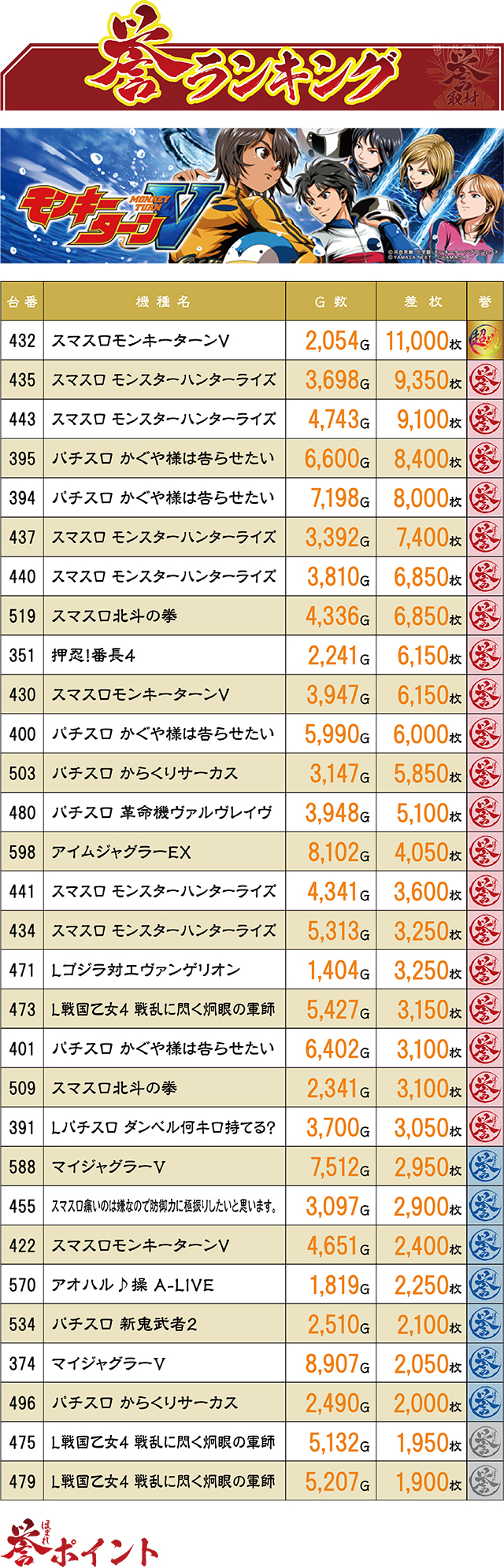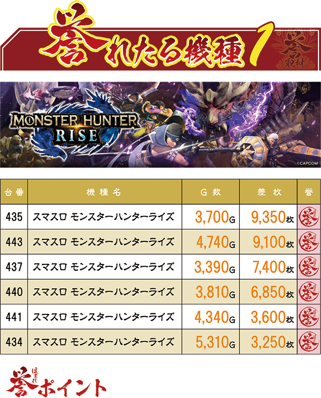 初・誉取材で、首位レコードの栄誉に輝いたのは『スマスロモンキーターンV』。10,000枚を超える見事な差枚でこの日の最高差枚記録となった。しかしそれを上回るインパクトを残したのが『スマスロ モンスターハンターライズ』。2・3位に連続ランクインしたばかりか、TOP30記録に6台が入賞する驚きの結果となった。