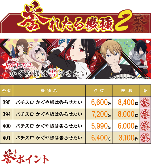 同じく半数が赤誉マークとなっていたのは『パチスロ かぐや様は告らせたい』。こちらも4台の誉マークの内3台が6,000枚超えと、かなりの破壊力を披露。打っていた方も早い段階で目の前の台の正体に気づいていたのではないだろうか。