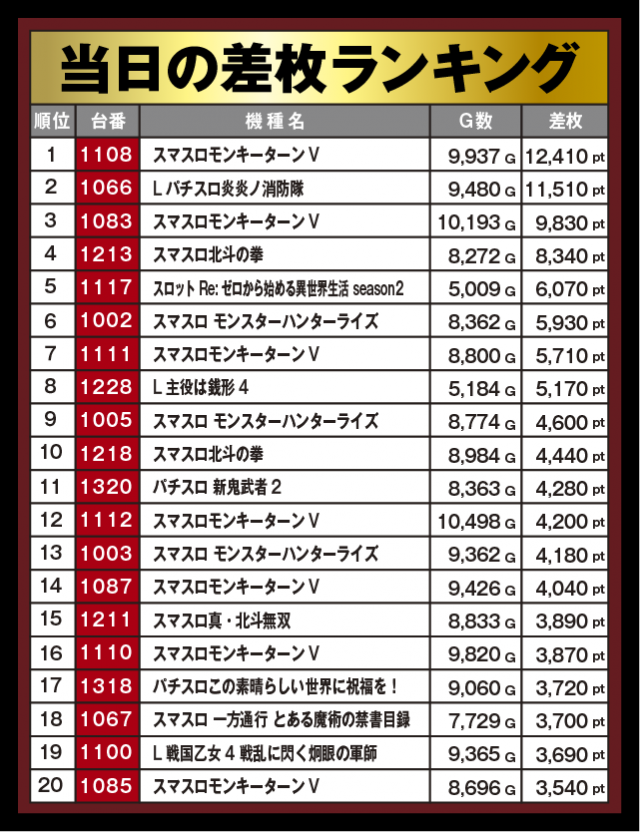 DMMぱちタウンは、SAP全店の特別なひとときを一斉取材した。特に華々しい活躍を残した機種たちをピックアップして紹介しよう。まずは「スロットキング南浦和」の差枚ランキングの発表だ!