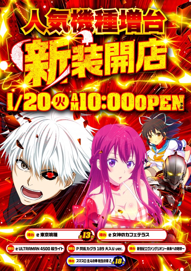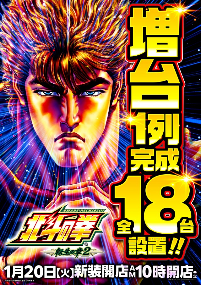 1月20日(火)新装開店予定!北斗の拳転生増台で1列完成!