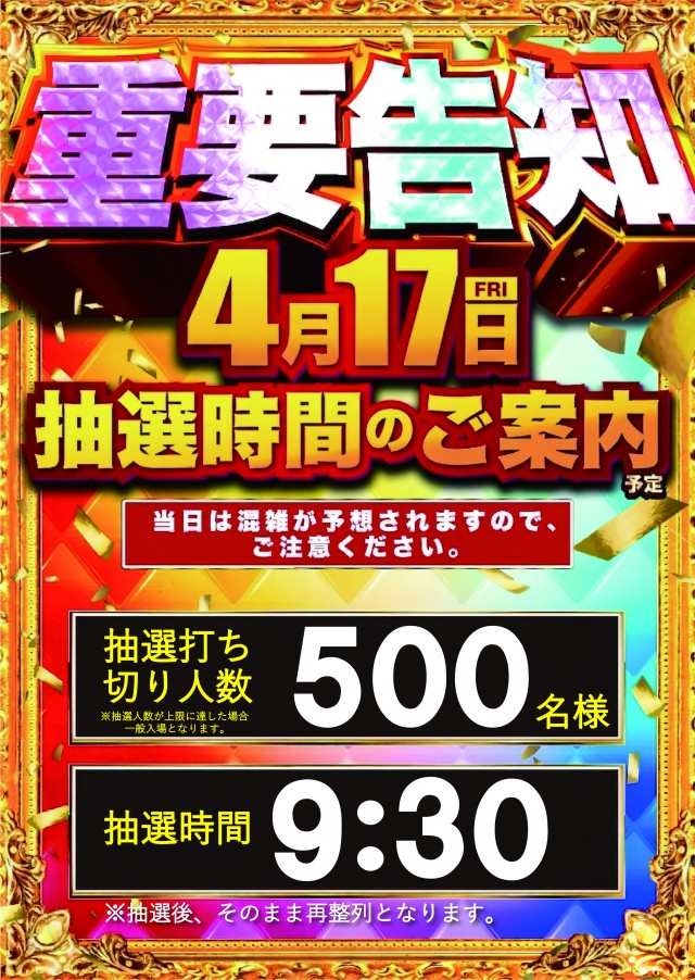 明日4/17は周年日!抽選は9時30分開始予定!!