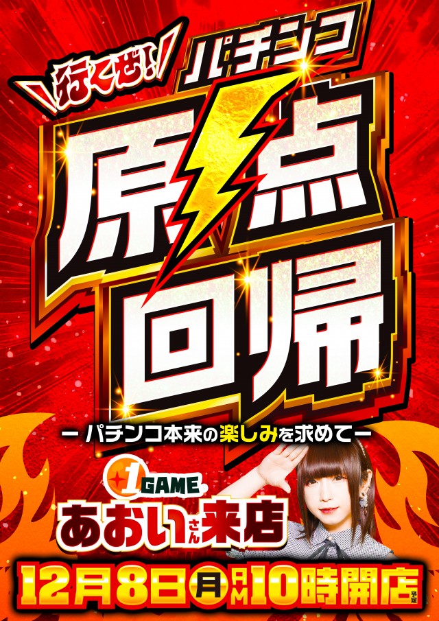 ガーデン東浦和明日のご案内12月8日(月)パチンコ/スロット新コンセプト展開!!!1GAMEあおいさん来店予定!10時開店予定