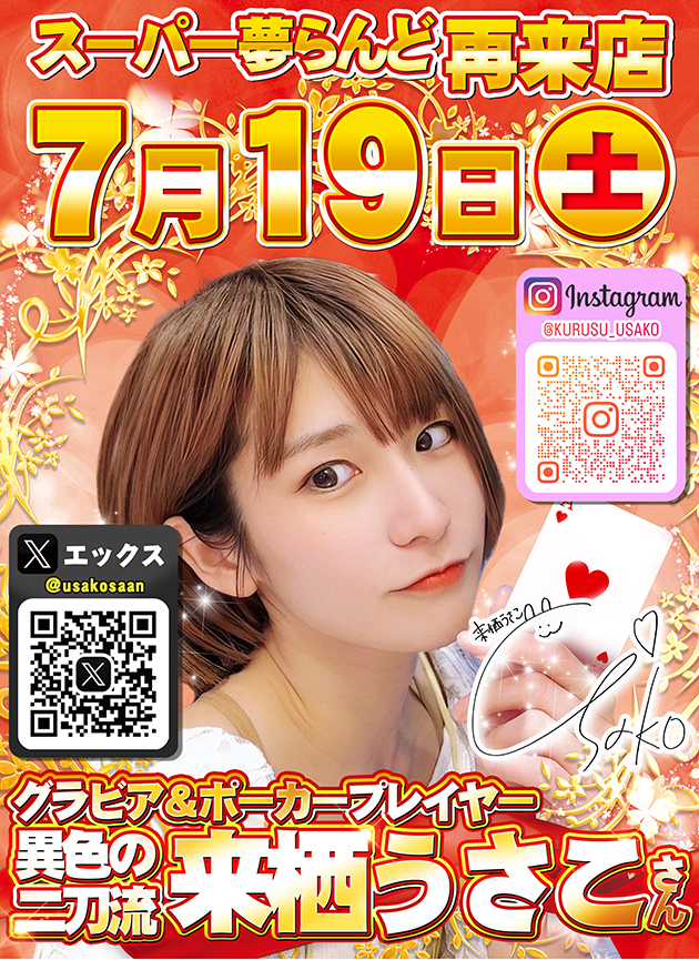 7月19日(土)『来栖うさこ』さん実戦来店予定!