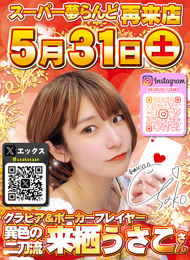 5月31日(土)『来栖うさこ』さん実戦来店予定!