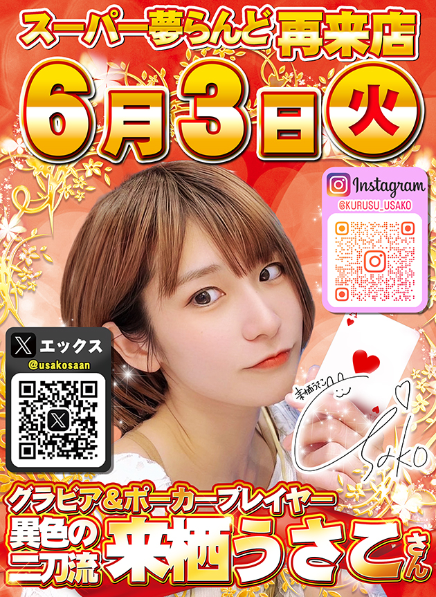 6月3日(火)新台入替『来栖うさこ』さん実戦来店予定!