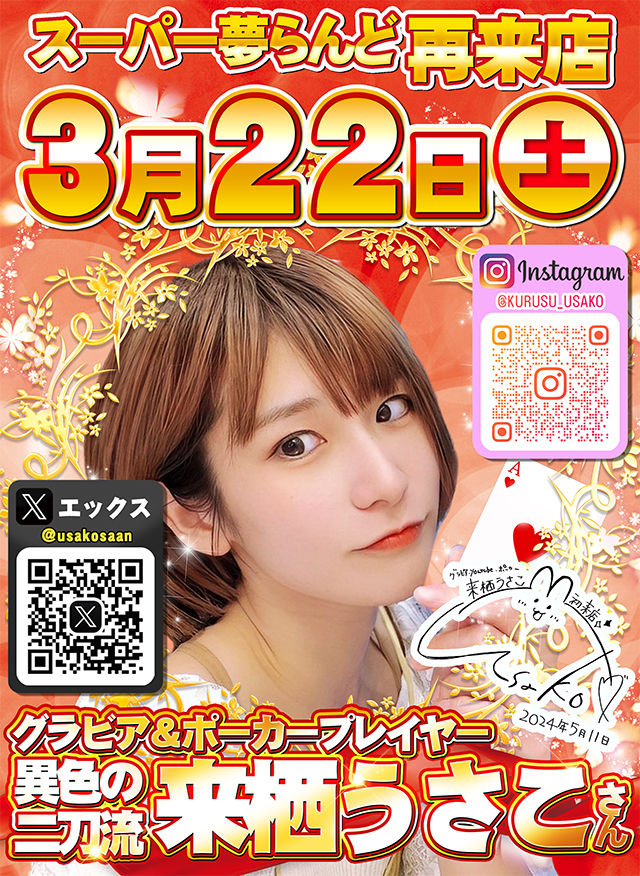3月22日(土)『来栖うさこ』さん実践来店予定!