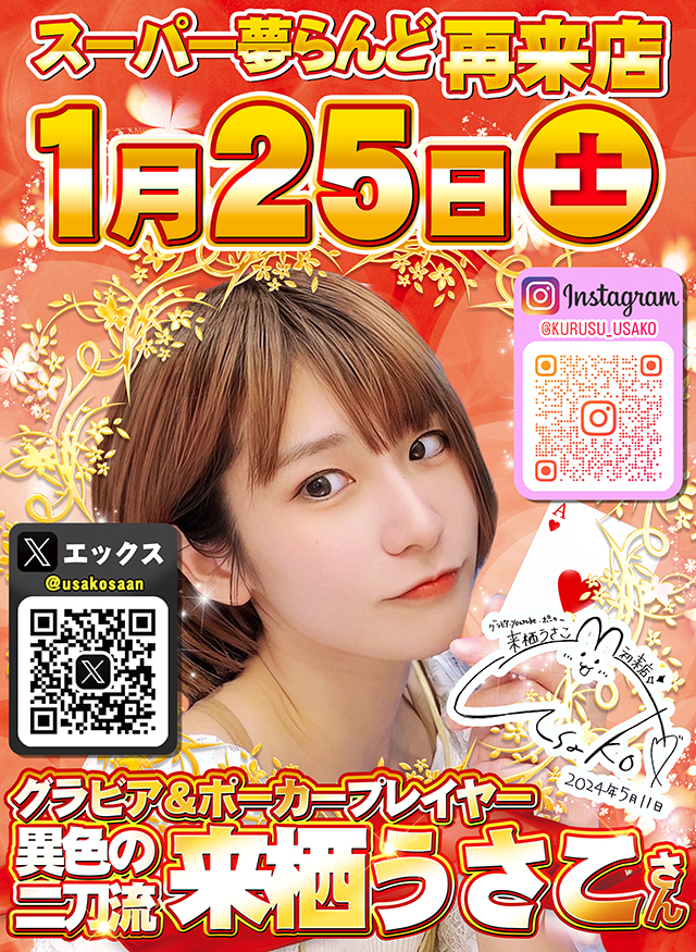 1月25日(土)『来栖うさこ』さん実践来店予定!