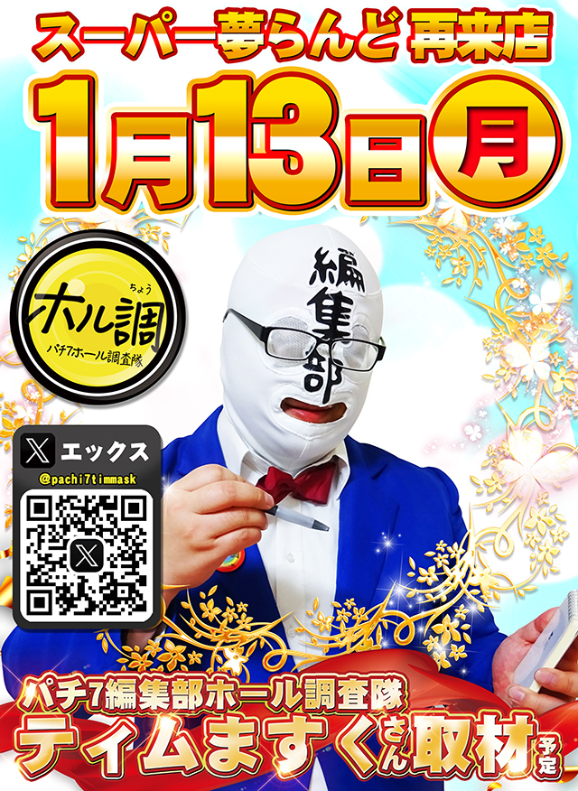 1月13日(月)パチ7ホル調『ティムますく』さん来店予定!