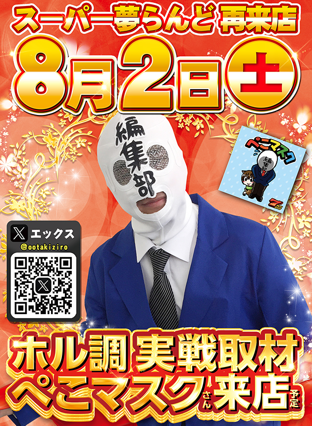8月2日(土)パチ7ホル調『ぺこマスク』さん実戦来店予定!
