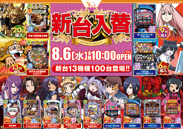 8/6(水)新台入替13機種100台登場!Renaさん来店!