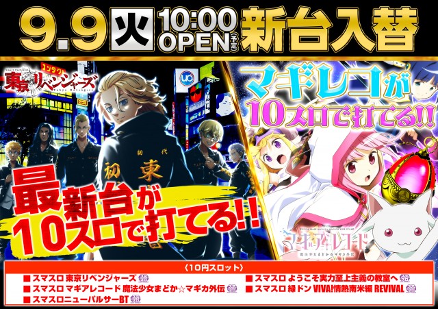 9月9日 東リベ×マギレコ導入! 最新台が10スロで打てる!