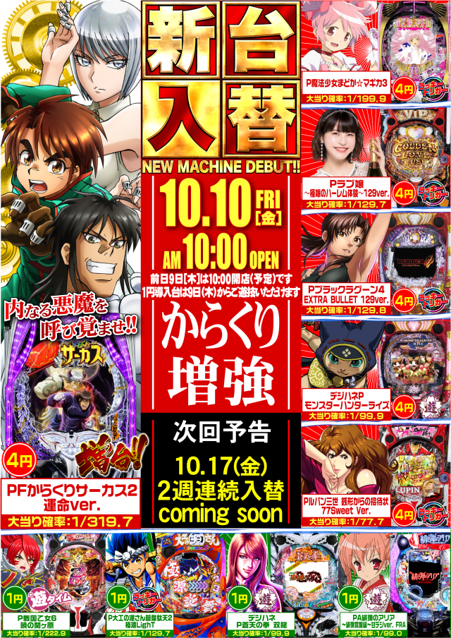明日10月10日(金)=新台入替初日=10時00分開店!!