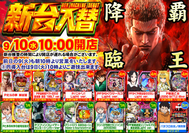 本日9月11日(木)=新台入替②日目=10時00分開店!!
