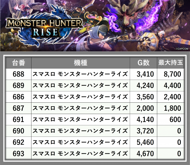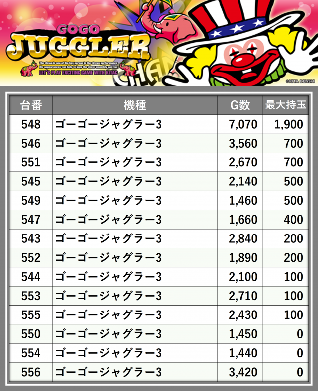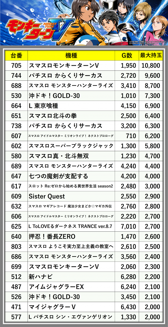 厳選された取材対象機種をはじめ、その他スロット全体から好記録が飛び出した!プレイヤーが楽しんだ1日を下記データにて振り返ってみて欲しい。