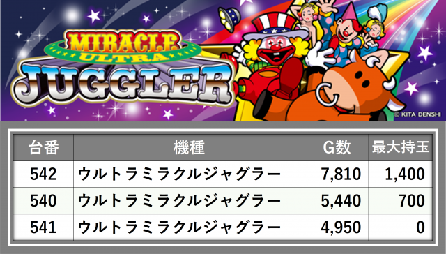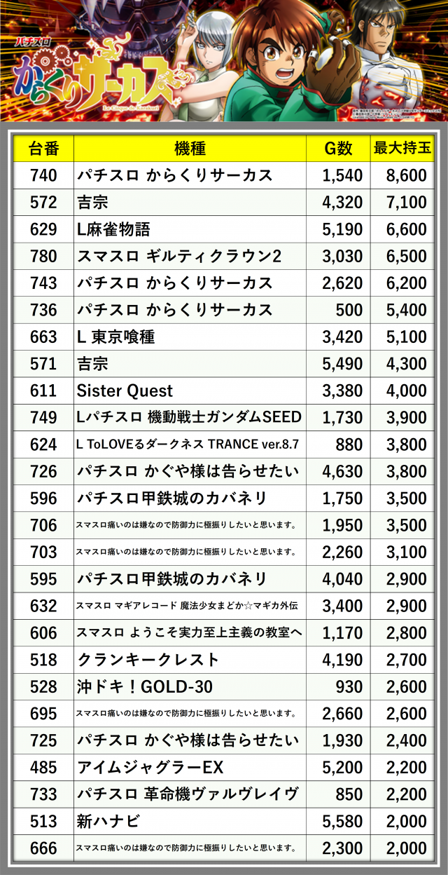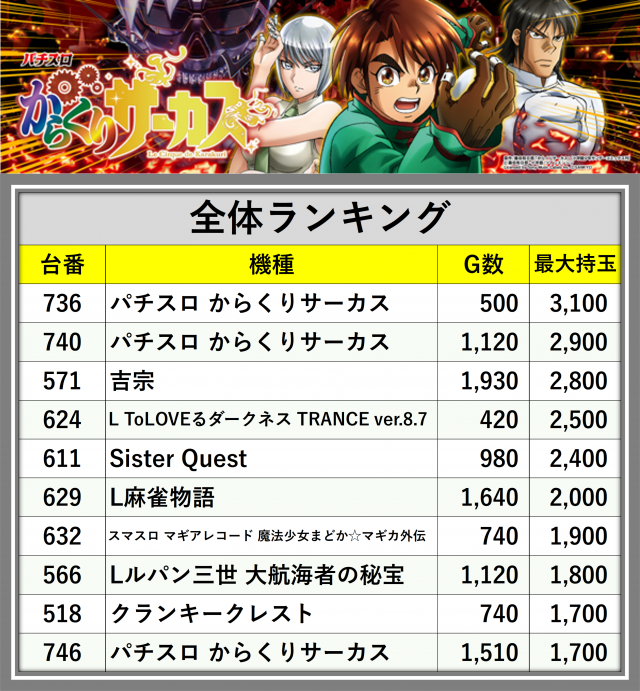 厳選された取材対象機種をはじめ、その他スロット全体から好記録が飛び出した!プレイヤーが楽しんだ1日を下記データにて振り返ってみて欲しい。