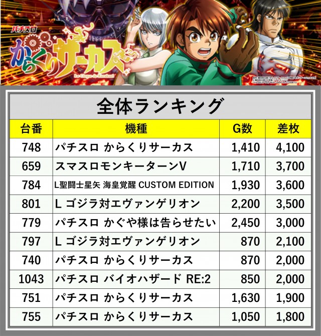 厳選された取材対象機種をはじめ、その他スロット全体から好記録が飛び出した!プレイヤーが楽しんだ1日を下記データにて振り返ってみて欲しい。