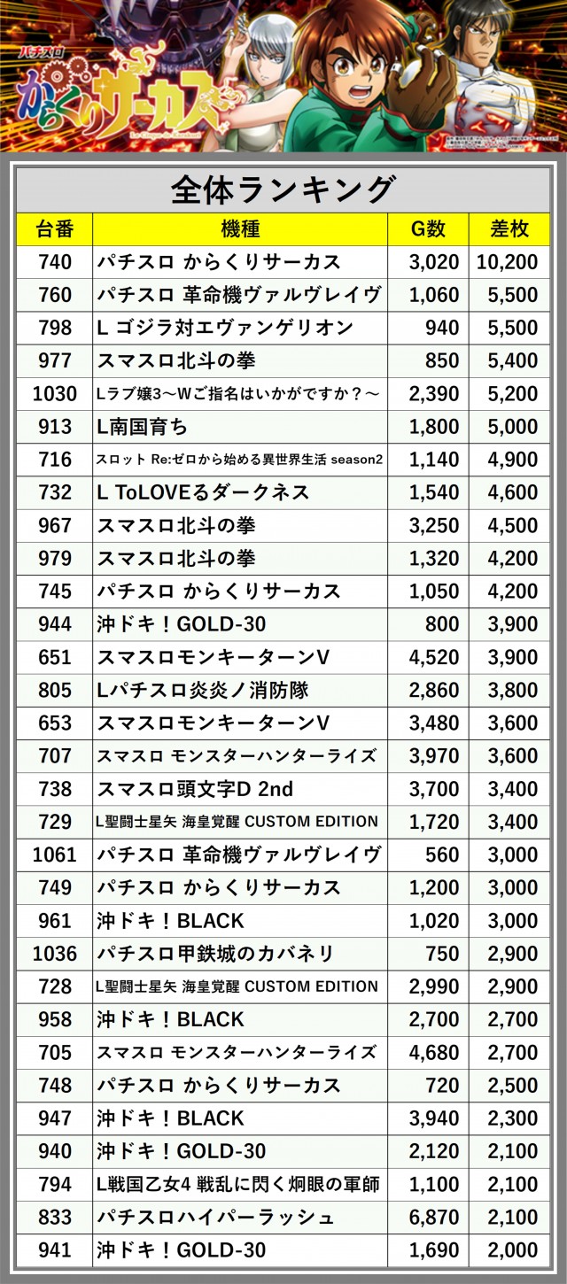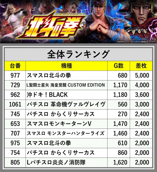 厳選された取材対象機種をはじめ、その他スロット全体から好記録が飛び出した!プレイヤーが楽しんだ1日を下記データにて振り返ってみて欲しい。
