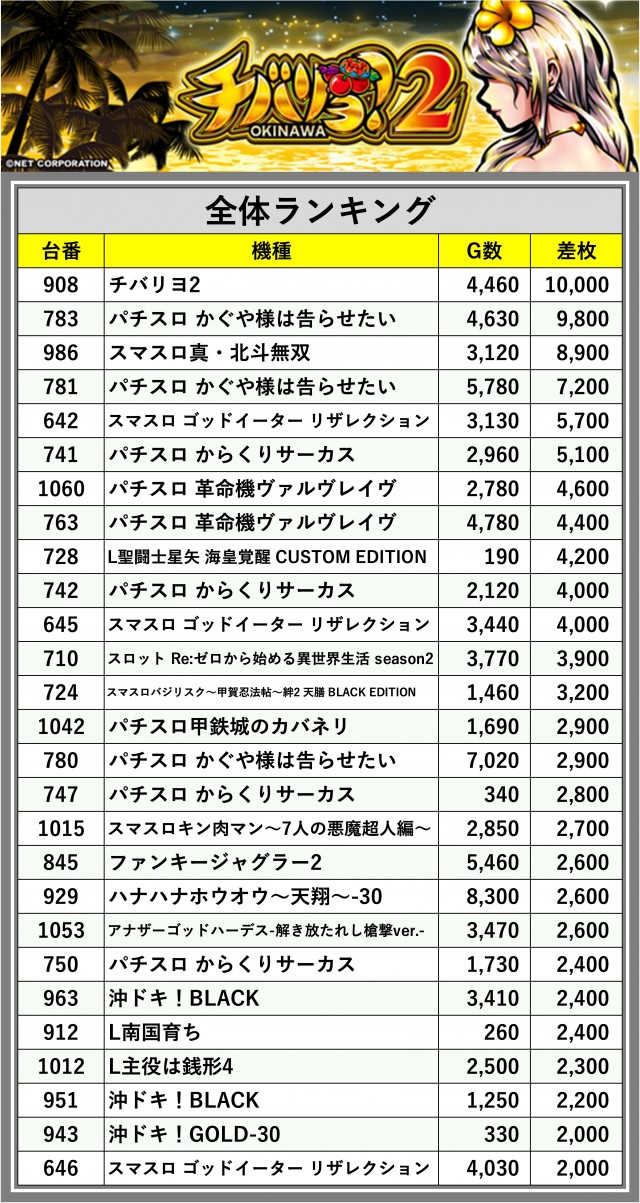厳選された取材対象機種をはじめ、その他スロット全体から好記録が飛び出した!プレイヤーが楽しんだ1日を下記データにて振り返ってみて欲しい。