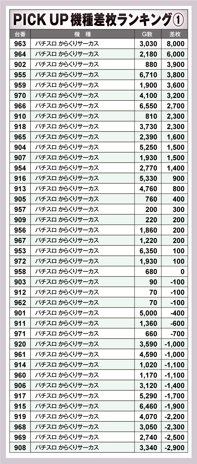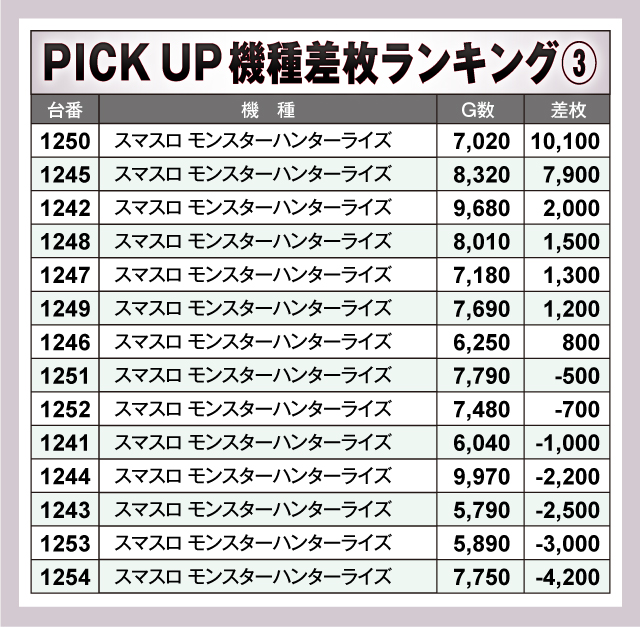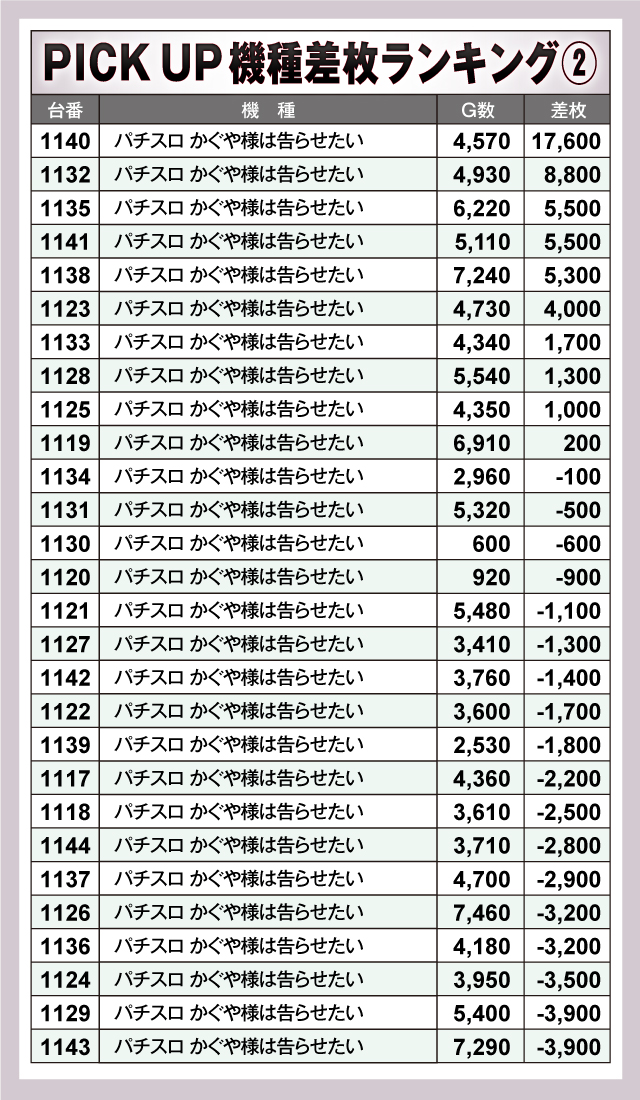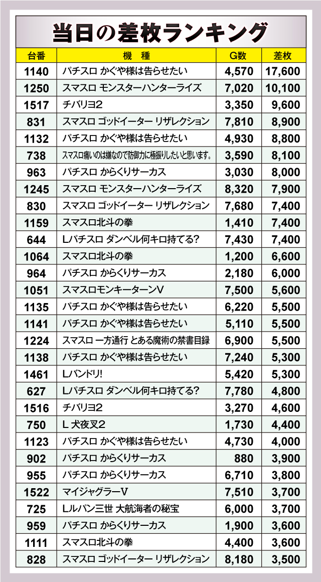 まずは差枚ランキングのチェックから。ランクインした30台すべてが+3,500枚オーバーを記録する驚異的な数値を見せるなか、『パチスロ かぐや様は告らせたい』と『スマスロ モンスターハンターライズ』が万枚オーバーを達成! 他にも人気スマスロの数多くが大台突破しており、その実力の高さに取材班も圧倒されっぱなしだった。