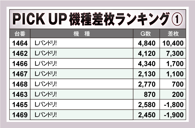 続いては、当日とくに盛り上がっていた3機種を紹介。3機種全てから好記録が続出で、とくに「Lバンドリ!」は、ピックアップ8台のうち4台が+1,000枚以上のプラスと圧倒的数値をマーク! もちろんこれら以外の機種にも良台を多数確認できたぞ!