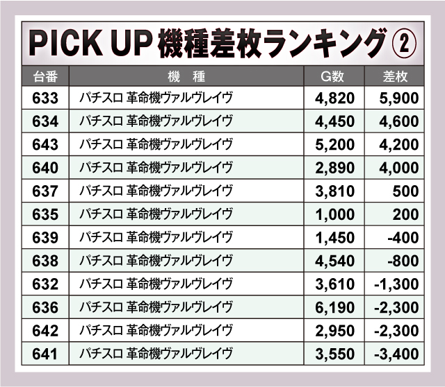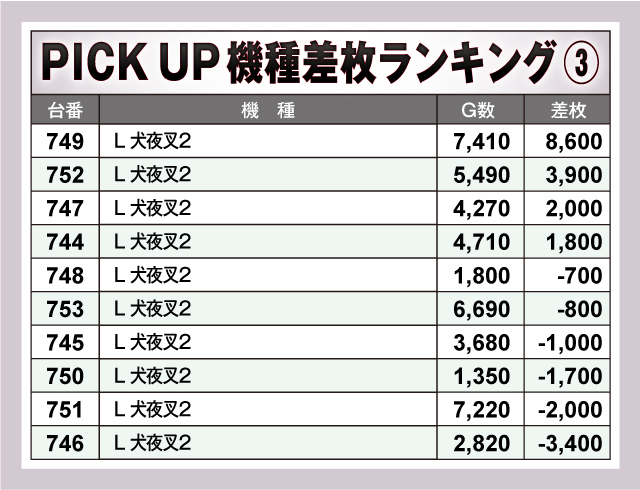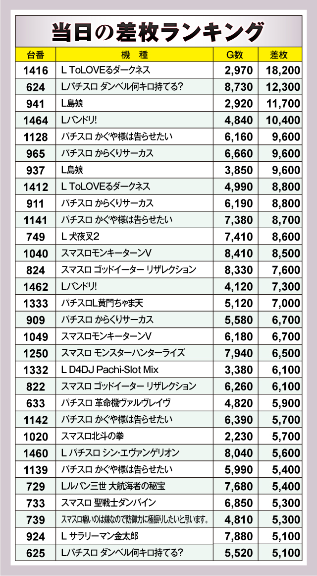 まずは差枚ランキングのチェックから。なんと30台すべてが+5,000枚オーバーの大幅プラスをマークし、大台突破の+10,000枚オーバーは4台出現! それらのなかでもっとも優秀だったのは、1416番台の「L ToLOVEるダークネス」で、差枚は驚異の+18,200枚を獲得! またランクイン機種を見渡してみると、人気のスマスロ機種を筆頭に最新機種などさまざまな機種がランクイン。ファンに注目が集まる機種全体にチャンスが隠されていたようだ!