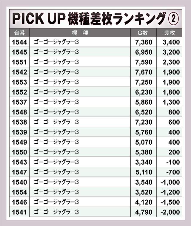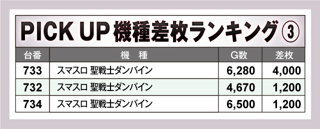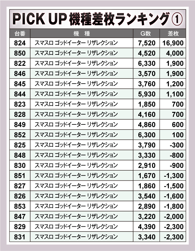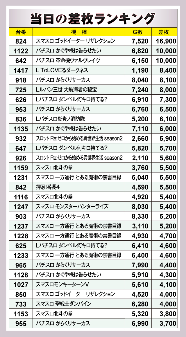 まずは差枚ランキングトップ30のチェックから。なんと30台すべてが+3,000枚オーバーを記録しており、+5,000枚オーバーは20台で、さらに+10,000枚オーバーの超記録は3台出現と素晴らしい結果がズラリ! それらのなかでもっとも優秀だったのは、824番台の「スマスロ ゴッドイーター リザレクション」で、差枚は+16,900枚と超絶記録をマーク! その他ランクイン機種には、人気スマスロ機種をはじめ「スマスロ 一方通行 とある魔術の禁書目録」や「スマスロ 聖戦士ダンバイン」などの導入間もない最新機種も複数ランクイン。店内のあらゆる機種にチャンスがあったようだ!