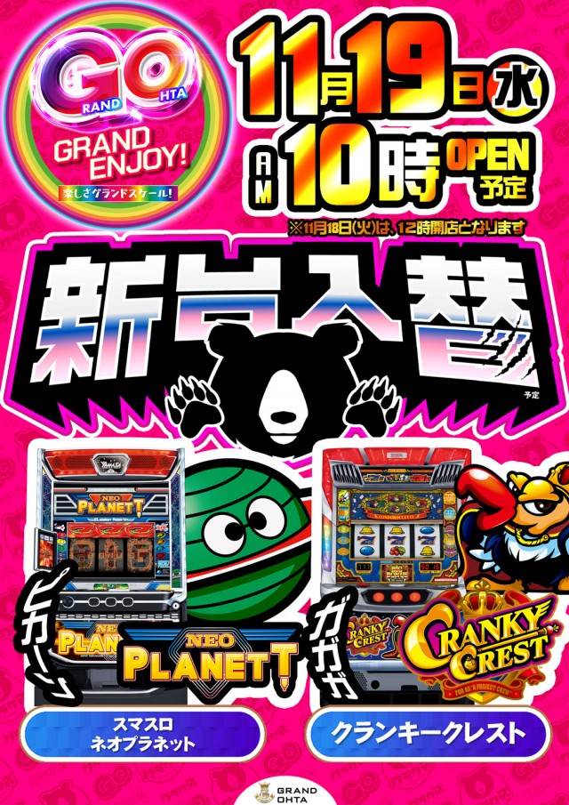 明日11月19日(水)新台入替あさ10:00開店