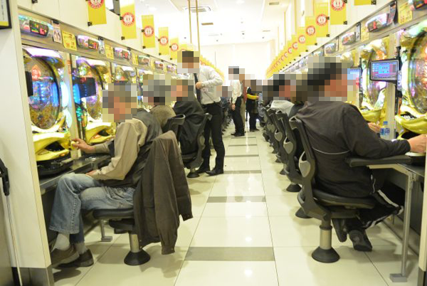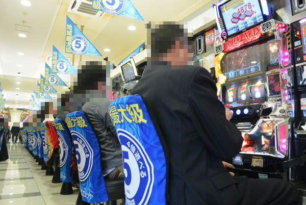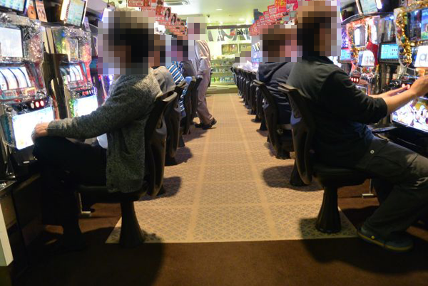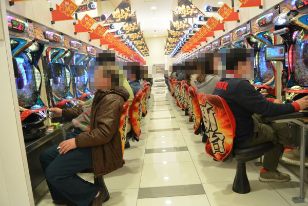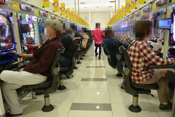 取材中で1番の盛況ぶりをみせた14時過ぎには、低貸し玉料金のシマも含めパチンコ・パチスロともにおおいに盛り上がっていた。