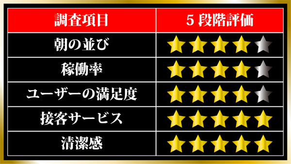 すべての台に自動計数カウンターが設置されていて、店内は広々としているため台移動がしやすい。また、ホール内でスイーツの試食会を行ったり、無料で飲料水を飲めたりと、プレイヤーが楽しめるようにサービス面でもさまざまな工夫をこらしているとも感じた。