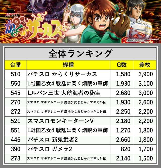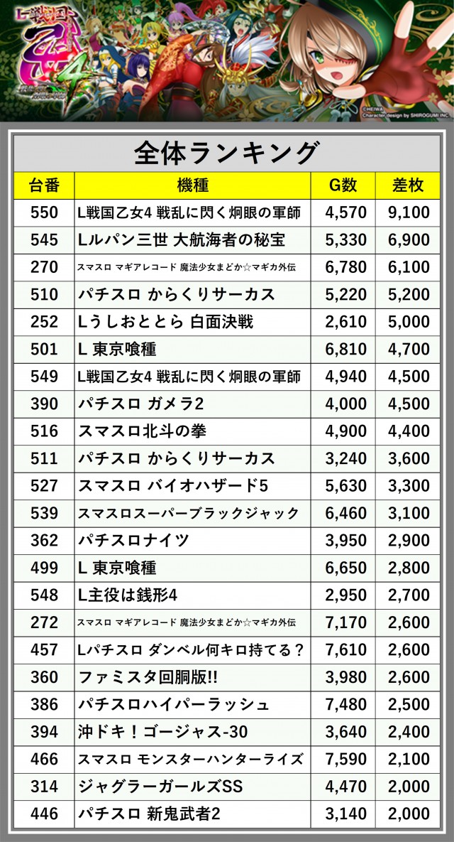 厳選された取材対象機種をはじめ、その他スロット全体から好記録が飛び出した!プレイヤーが楽しんだ1日を下記データにて振り返ってみて欲しい。