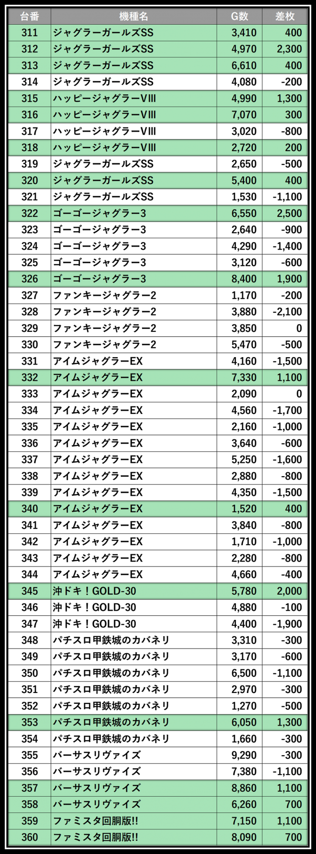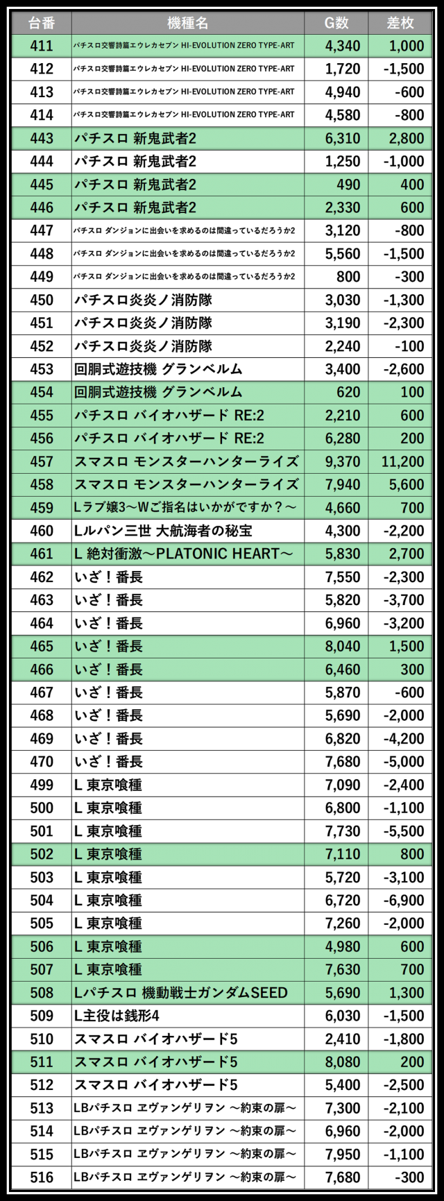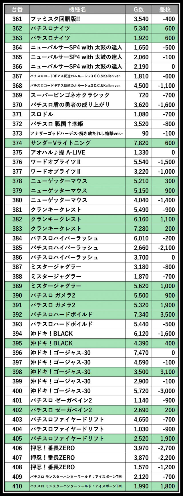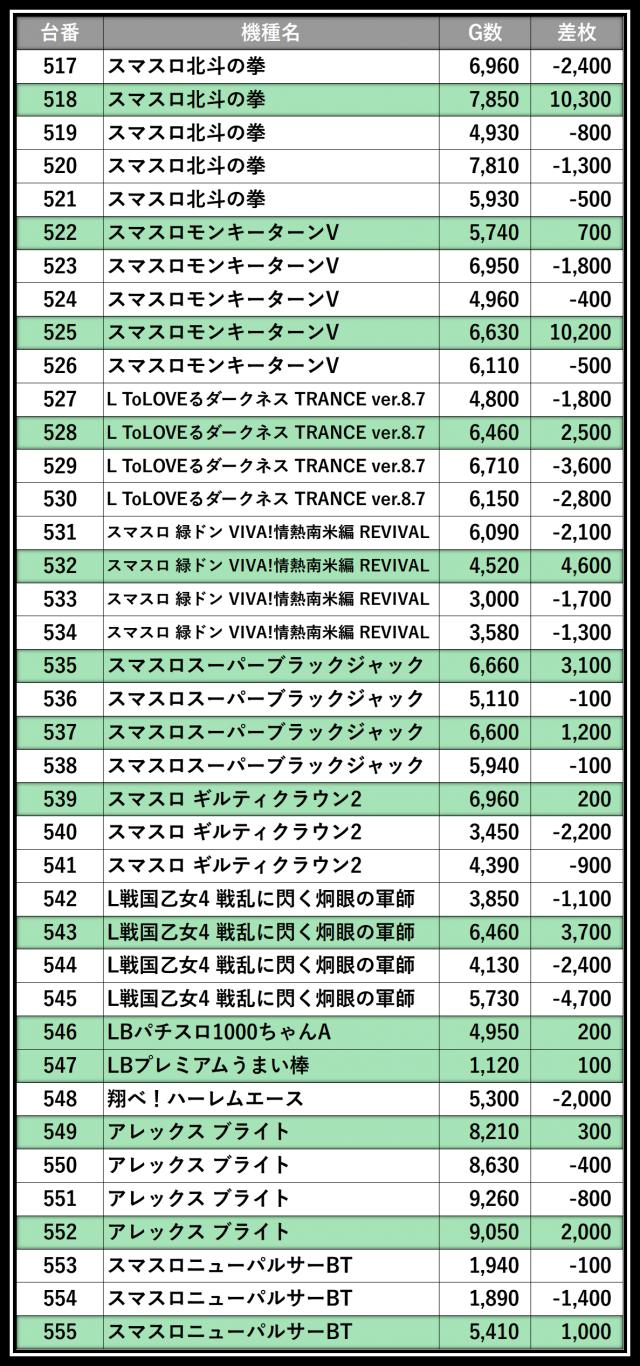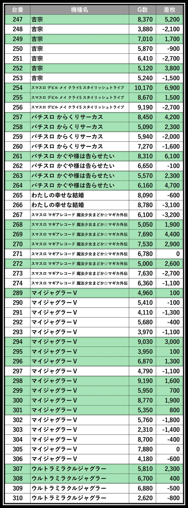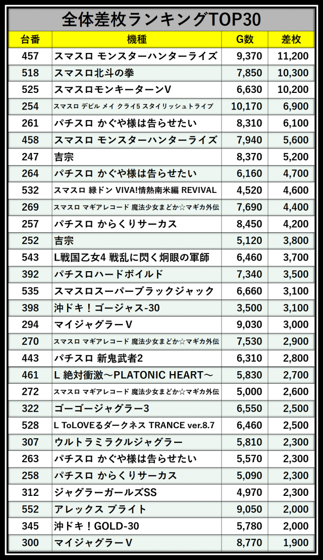 ※差枚数順に掲載しています