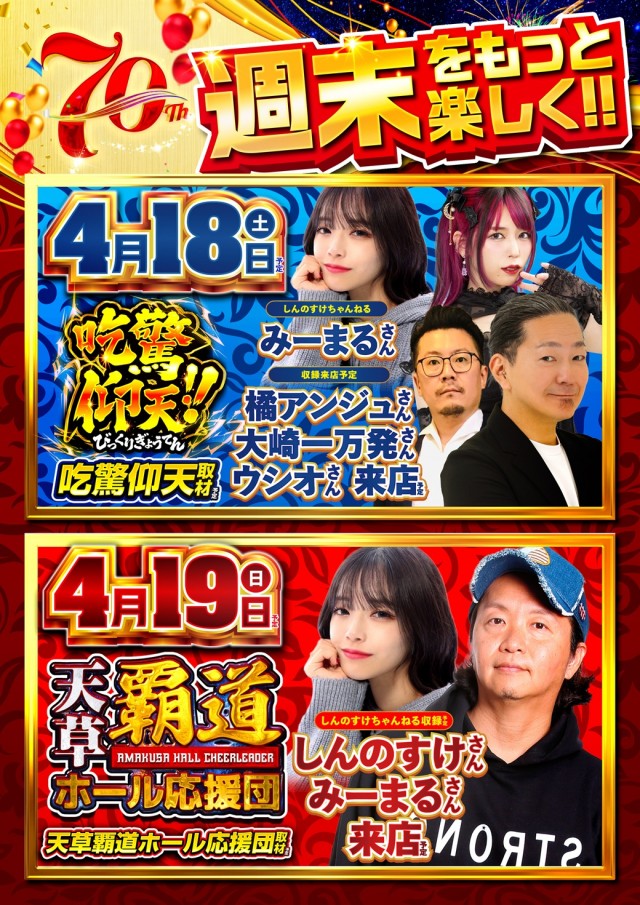 明日4月19日(日)✨天草覇道ホール応援団取材予定✨✨しんのすけちゃんねる✨しんのすけさん&みーまるさん来店予定