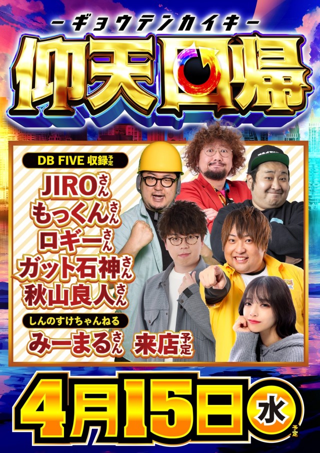 明日⚡4月15日(水)⚡\しんのすけちゃんねる/💓みーまるさん💓来店✨予定DB FIVE収録来店予定!JIROさんもっくんさんロギーさんガット石神さん秋山良人さん来店予定!